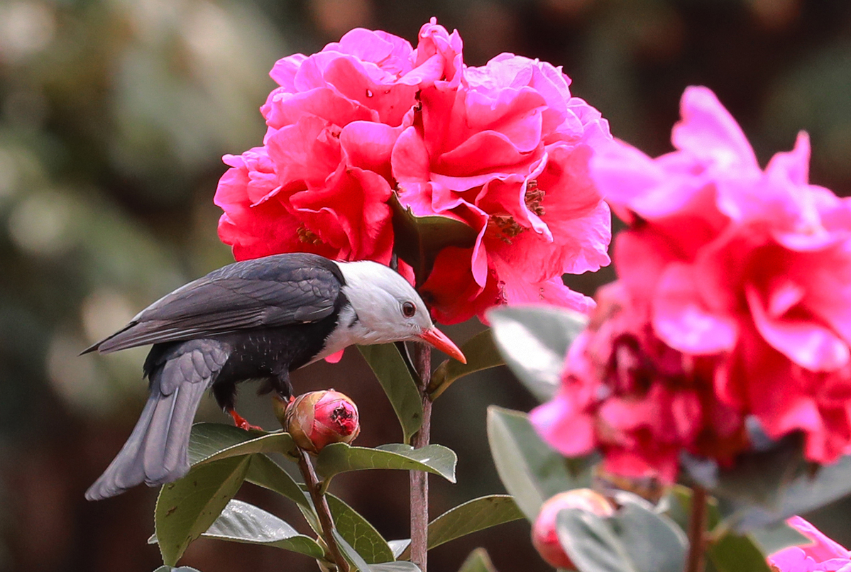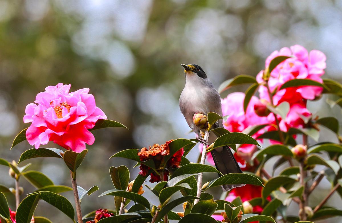AbirdperchesonabranchofcamelliablossomsatLaifengshanNationalForestParkinTengchong,Yunnanprovince.[PhotobyLiuZhengfan/Forchinadaily.com.cn]